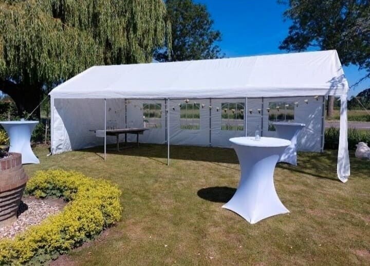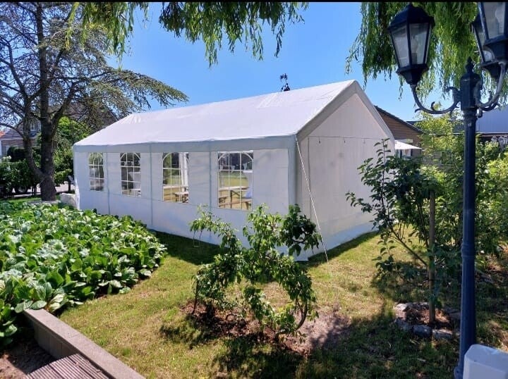Deze ruime tent van 4x8 meter bied ruimte aan maximaal 40 personen. Ideaal voor een tuinfeest, jubileum of bruiloft. U kunt zelf bepalen welke wanden u wel of niet wilt dicht hebben, afhankelijk van de weersomstandigheden en omgeving.