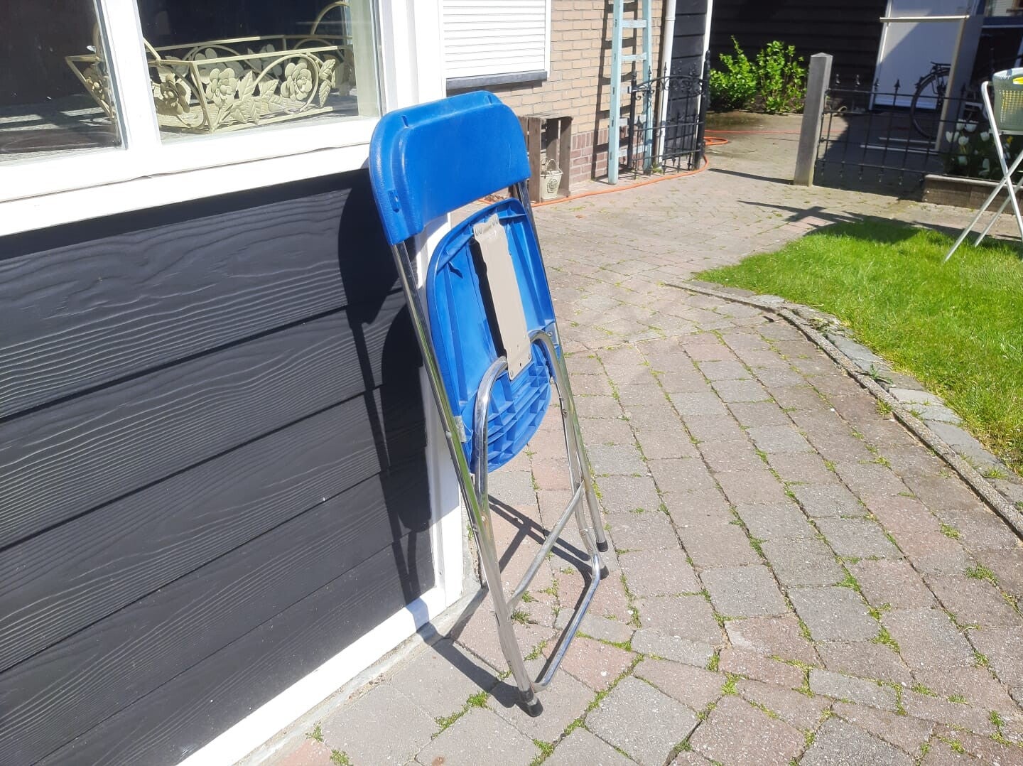 Stevige, klapstoelen in een frisse blauwe kleur.